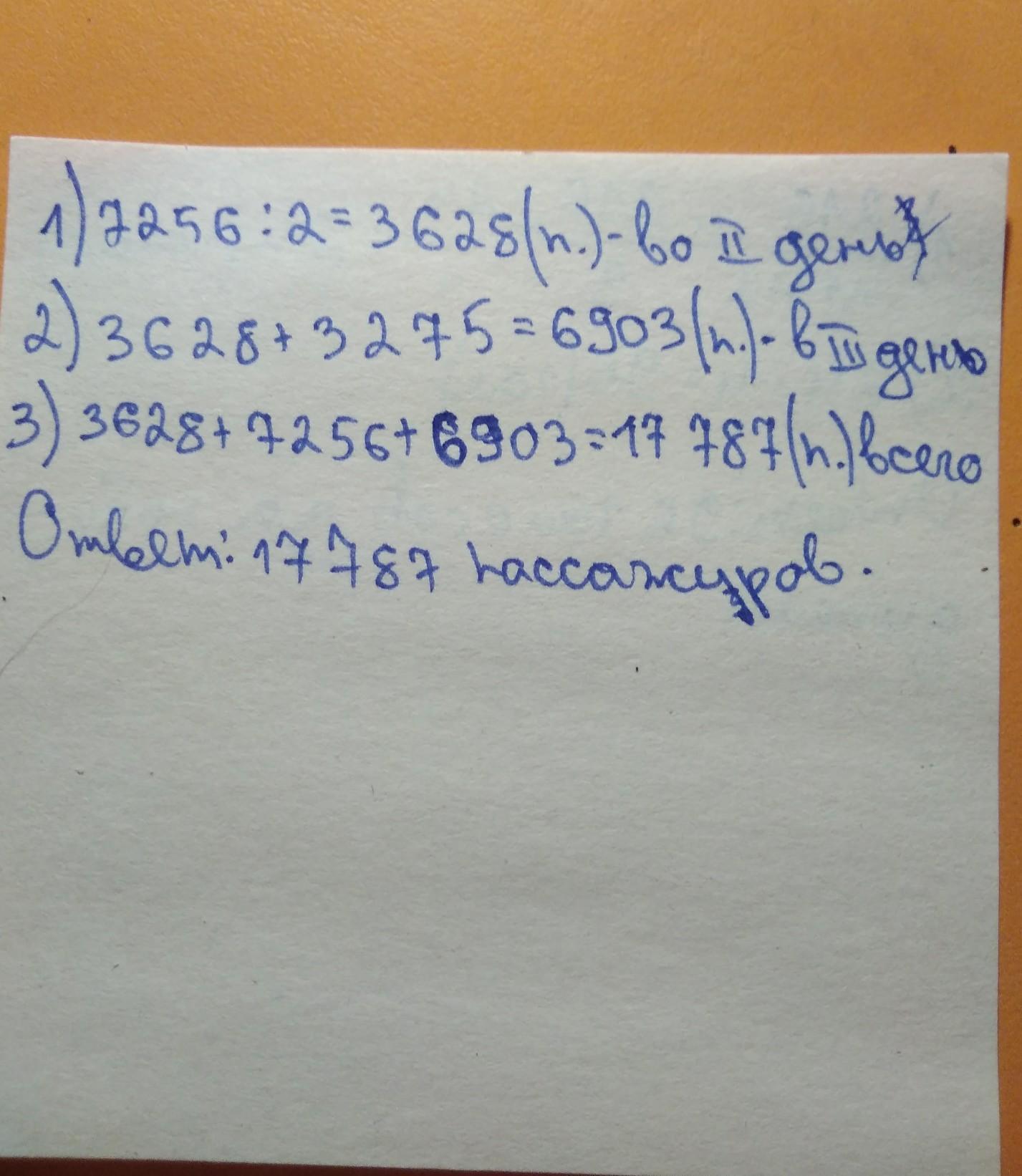 В первый день в метро было 7256 пассажиров, во второй день в 2 раза меньше, а в третий день на 3275 пассажиров больше, чем в первый и второй вместе. Сколько всего пассажиров перевезли поезда метро за три дня