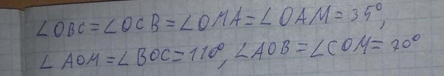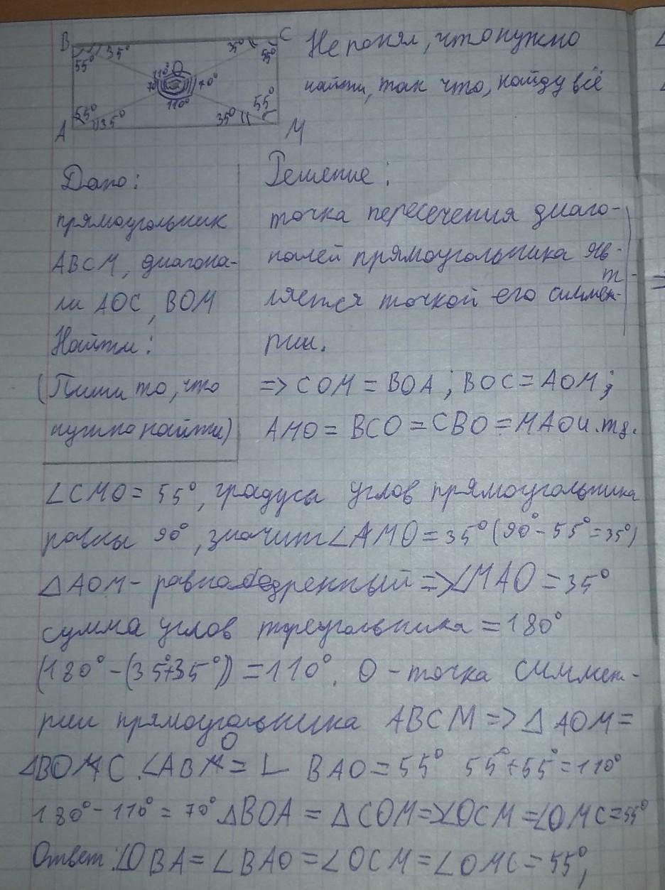 Диагонали пярмоугольника ABCM пересекаются в точке O. Найдите угол между диагоналями, если угл CMO = 55 градусев