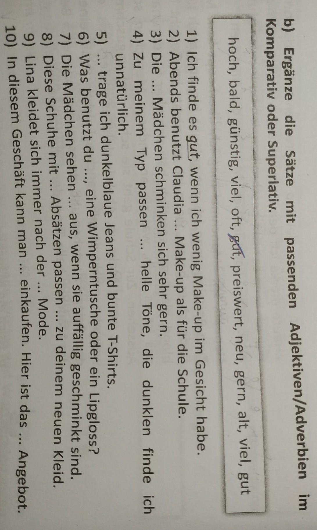 1. besser (я бы здесь написала "besser", а не как в образце ответа, спроси учителя. Нам дано задание использовать СРАВНИТЕЛЬНУЮ и ПРЕВОСХОДНУЮ степени, а не положительную.