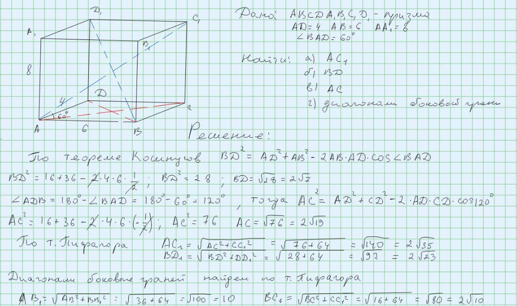 ABCD - параллелограмм со сторонами 4 и 6 и углом60∘, А высота призмы равна 8 (рис.). Найдите: