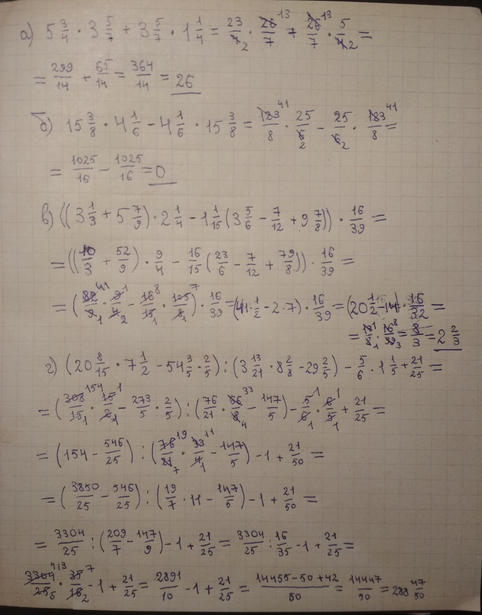 5 3/4 ·3 5/7 +3 5/7 ·1 1/4=3 5/7· (5 3/4 +1 1/4)=26/7 ·7=26