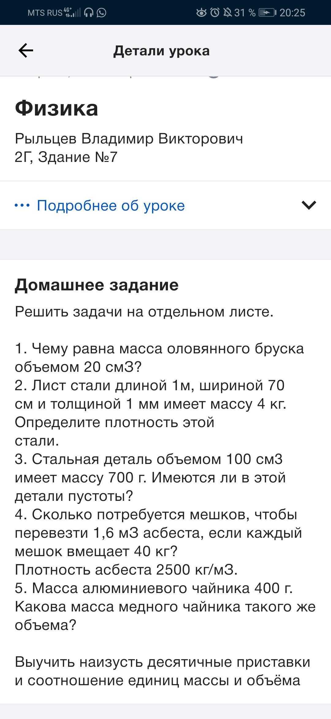 Массу находим по формуле m = pV = 7,3 г/см3 * 20 см3 = 146 г.