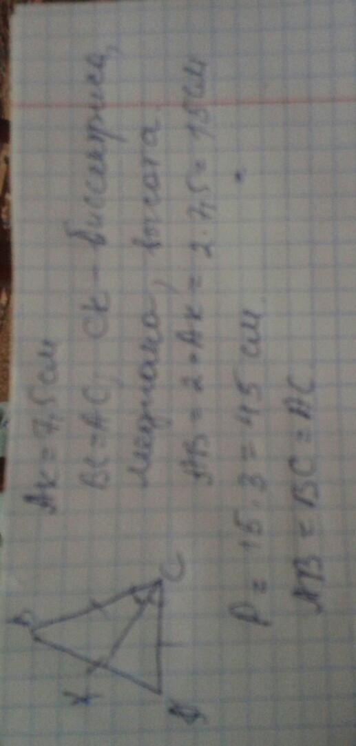 Трохвугольник ABC--роунастаронни, CK- яго бисектрыса, AK=7.5 см. Знайдзите перыметр Трохвугольника ABC.