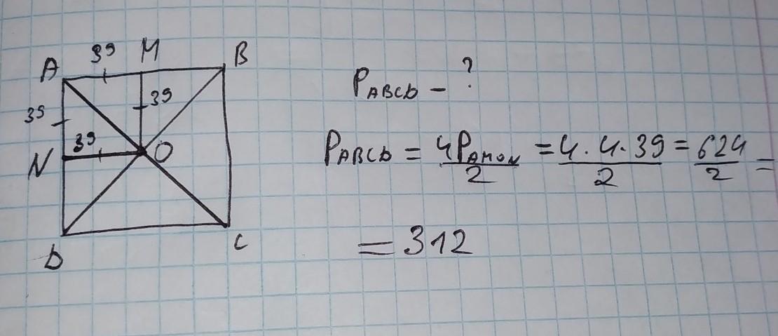 в квадрате расстояние от точки пересечения диагоналей до одной из его сторон равно 39. Найдите периметр этого квадрата