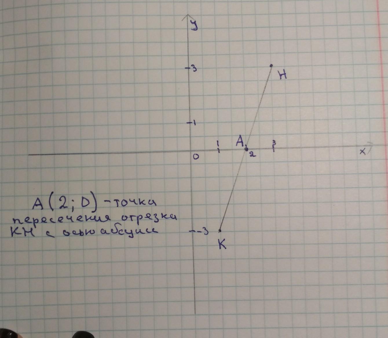 Отметьте на координатной плоскости точки К(1;-3) и Н(3;3). Проведите отрезок КН. Найдите координаты точки пересечения отрезка КН с осью абсцисс.