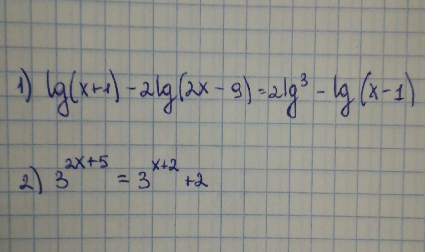 2) Честно, не помню, как решаются эти уравнения, но если представить, что y=3^2x+5 и y=3^(x+2) +2, как монотонно возрастающие функции, то решением этого уравнения будет одно значение х=-2. Ну или просто построй графики и там будет точка пересечения этих графиков (-2;3). Ответ по-прежнему -2.