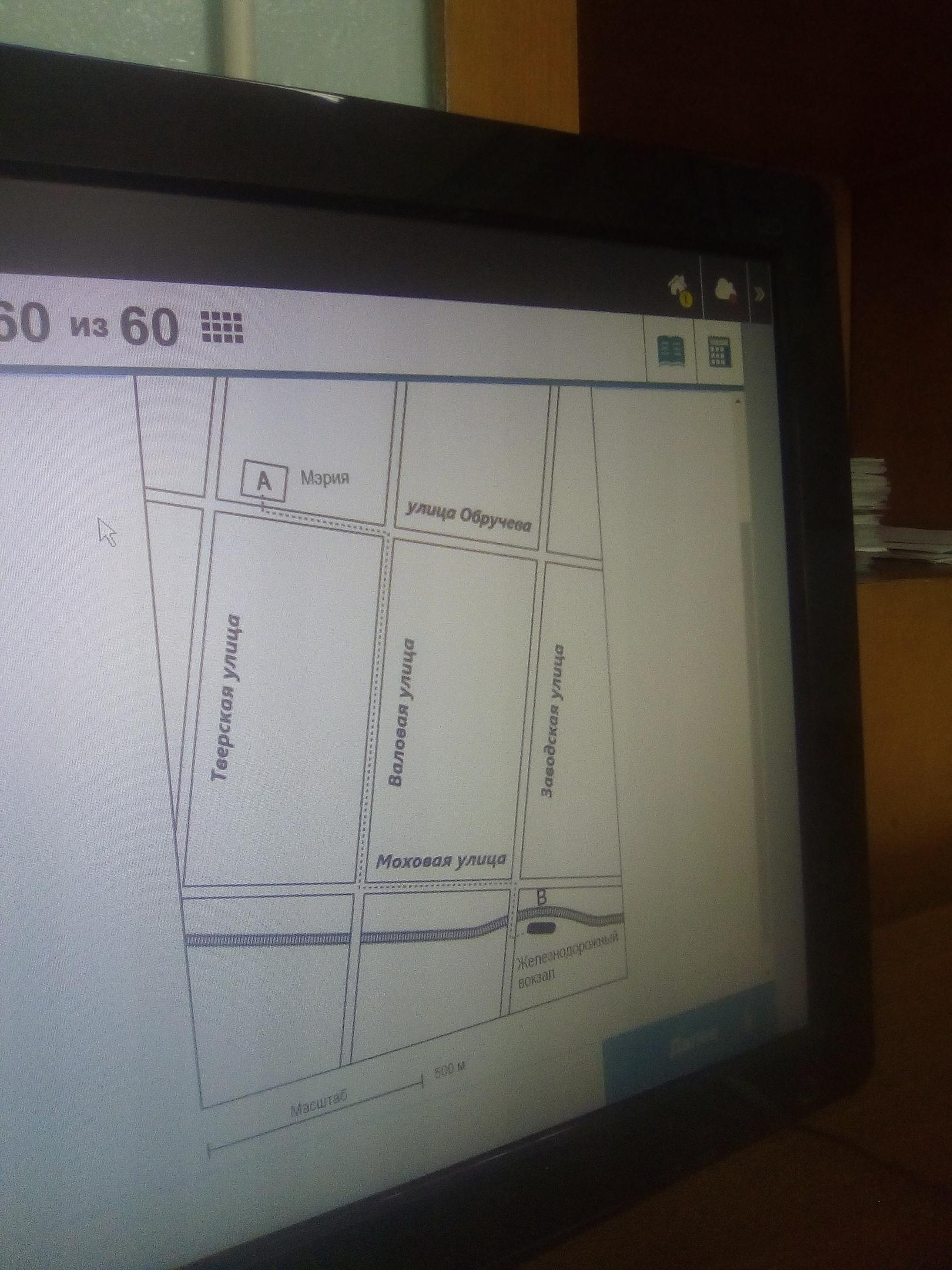 твоя картинка под углом снята и трудно считать. Я обьясню тебе, как делать. Возьми линейку и померь , сколько см. у тебя будет отрезок масштаба внизу рисунка. Например, он будет 10 см. Тогда, как написано на рисунке, эти измеренные 10 см =500м плана. То есть в 1 см = 500:10=50м (Ты пересчитаешь для своих цифр: 500 разделишь на измеренное). Теперь измерь линейкой длину пунктирной линии от мэрии до вокзала (сложи весь путь по кусочкам). Получится какое-то число. Например, 25 см. А мы знаем, что у нас в 1 см=50м, значит 25см=25*50=1250м (А ты пересчитаешь это для своих цифр).