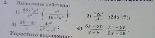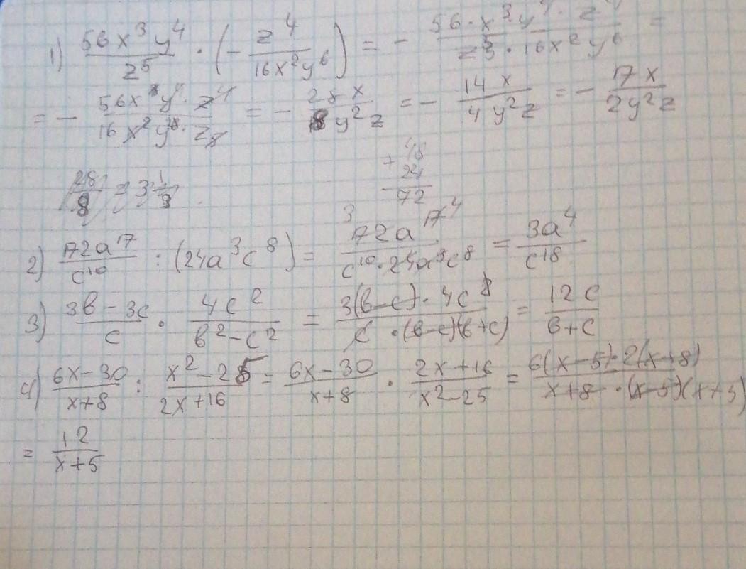 1) ((56 * x^3 * y^4) / (z^5)) * ((-z^4) / (16 * x^2 * y^6)) = -(56 * x^3 * y^4 * z^4 / z^5 * 16 * x^2 * y^6 = -(7x/(2y^2*z))