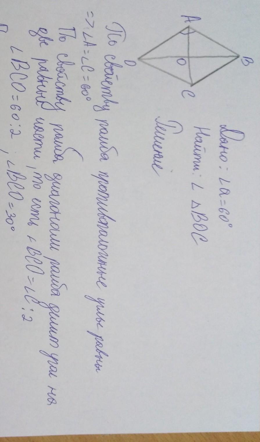 в ромбе abcd угол a равен 60 градусов. диагонали ромба пересекаются в точке о найти углы тргеугольника boc