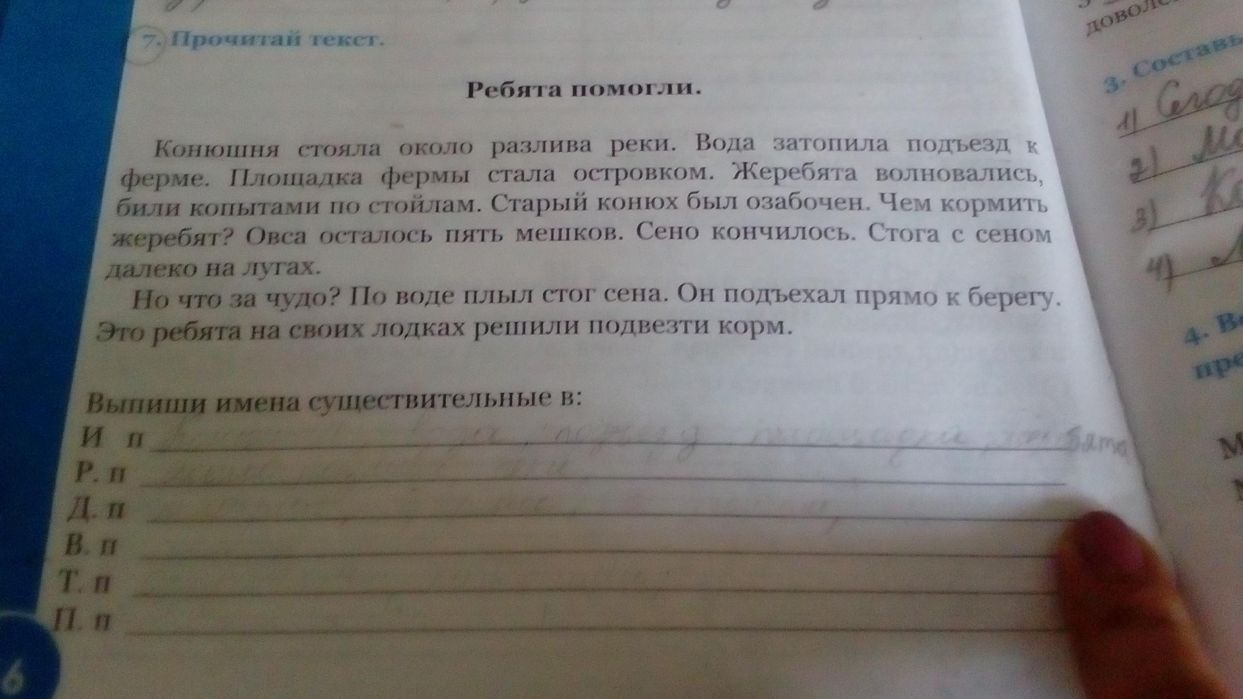 Ответ:И. П. :конюшня, вода, площадка, жеребята, конюх, сено, стог, ребята,пять.