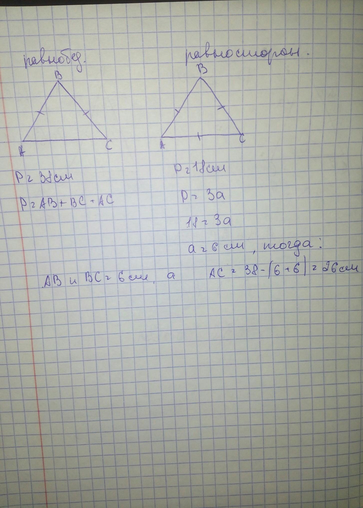 если в условии про два треугольника, причем совершенно разных, дан периметр, единственное по чему их можно связать - это по сторонам, которые одинаковые. в равнобедренном АВ и ВС, а в равностороннем все три: АВ,ВС,АС. В равностороннем можно найти сторону а. потом логически подумав, если АВ И ВС равны, значит они равны 6, а все остальное - это основание АС
