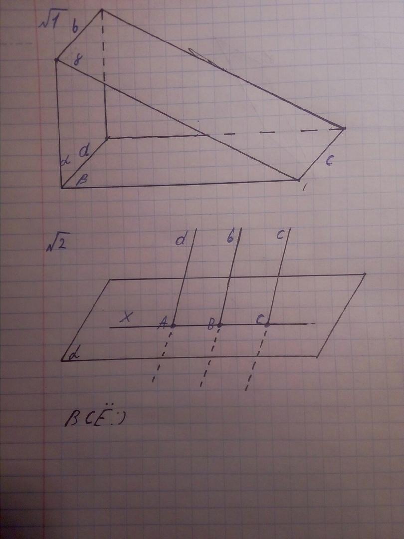 б) Плоскость α пересекает три параллельные прямые a, b, c соответственно в точках A, B, C, лежащих на одной прямой.