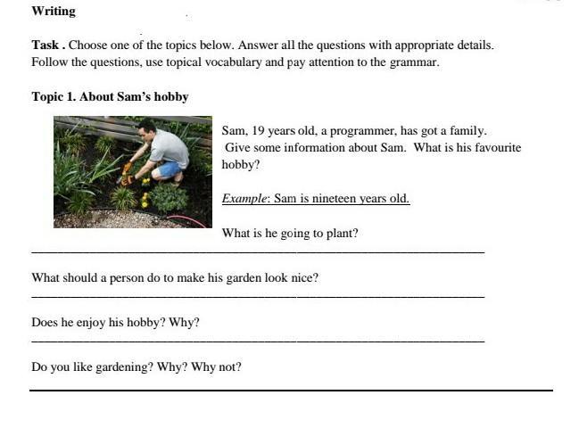 Ответ:1 Sam is going to plant different kinds of vegetables. 2. I believe plant different trees, bushes and take a proper care of them. 3 Im sure Sam likes gardening, who doesn’t like to work on the fresh air? 4 Yeah I enjoy gardening, because it’s very relaxing.