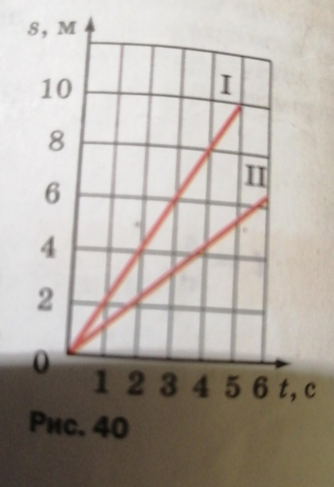 По графикам зависимости пути от времени (рис. 40) двух тел, движущихся равномерно, определите скорости этих тел. Скорость какого тела больше?