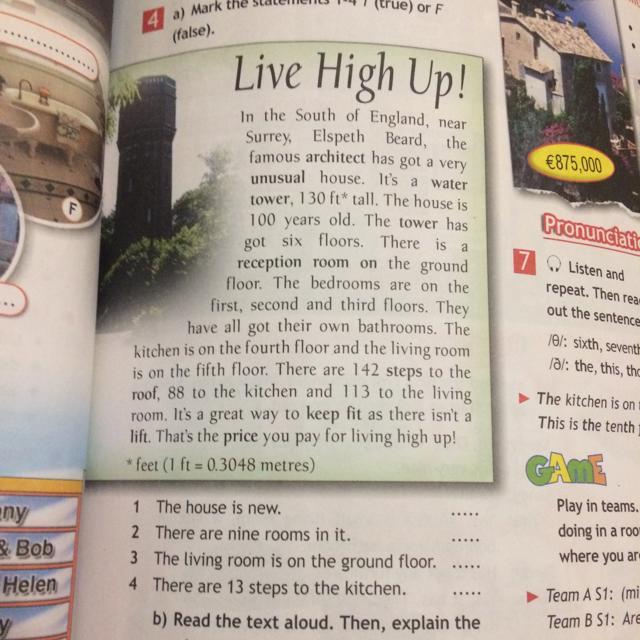 На юге Англии, недалеко от Суррея, у Элспет Борода, у известного архитектора появился очень необычный дом. Это водонапорная башня, 130 футов * в высоту. Дому 100 лет. Башня имеет шесть этажей. На первом этаже находится приемная. Спальни находятся на первом, втором и третьем этажах. У всех есть свои ванные комнаты. Кухня находится на четвертом этаже, а гостиная - на пятом этаже. Есть 142 ступеньки на крышу, 88 на кухню и 113 на гостиную. Это отличный способ поддерживать себя в форме, так как нет лифта. Вот цена, которую вы платите за жизнь высоко