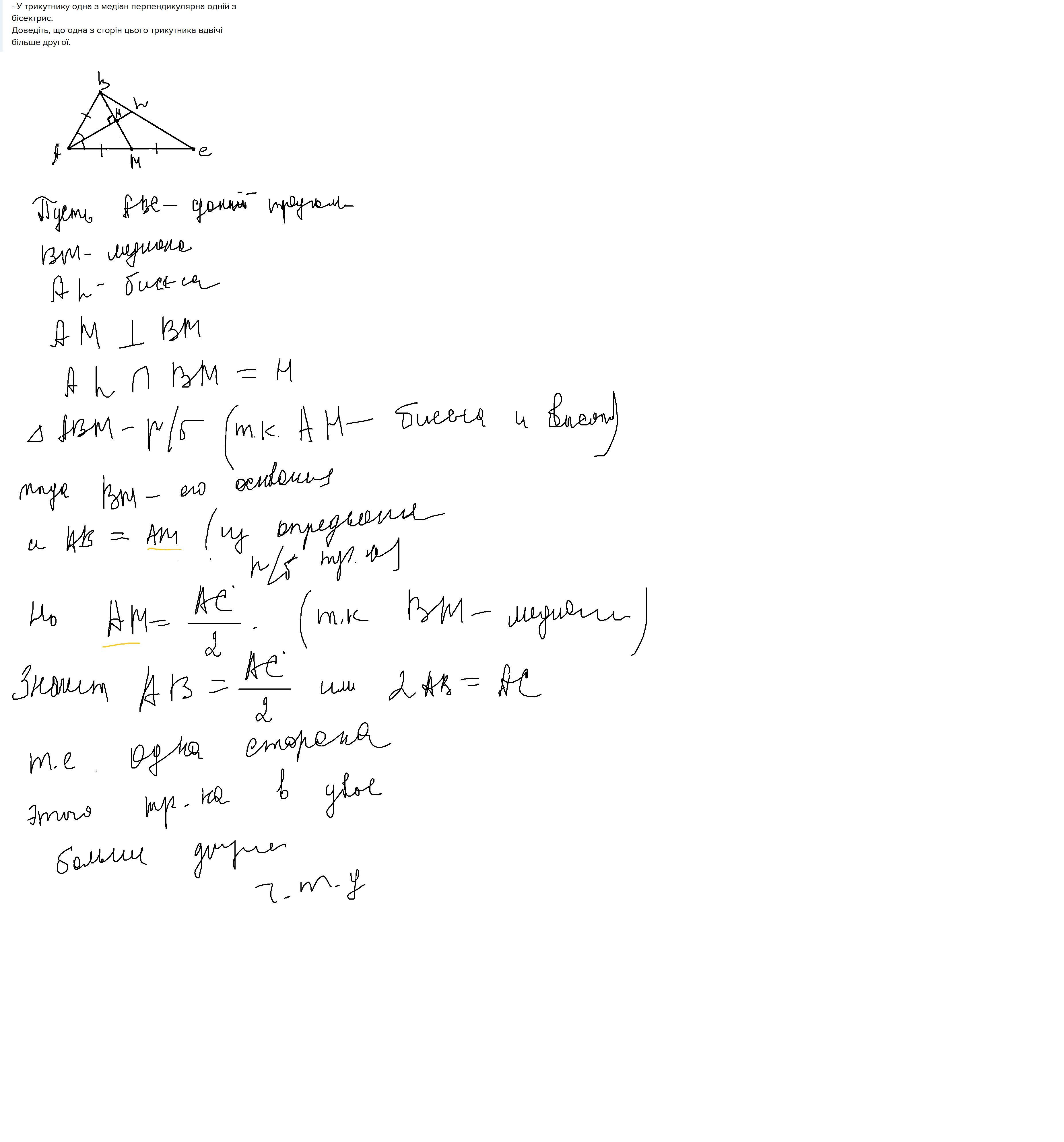 Объяснение: У трикутнику одна з медіан перпендикулярна одній з бісектрис.