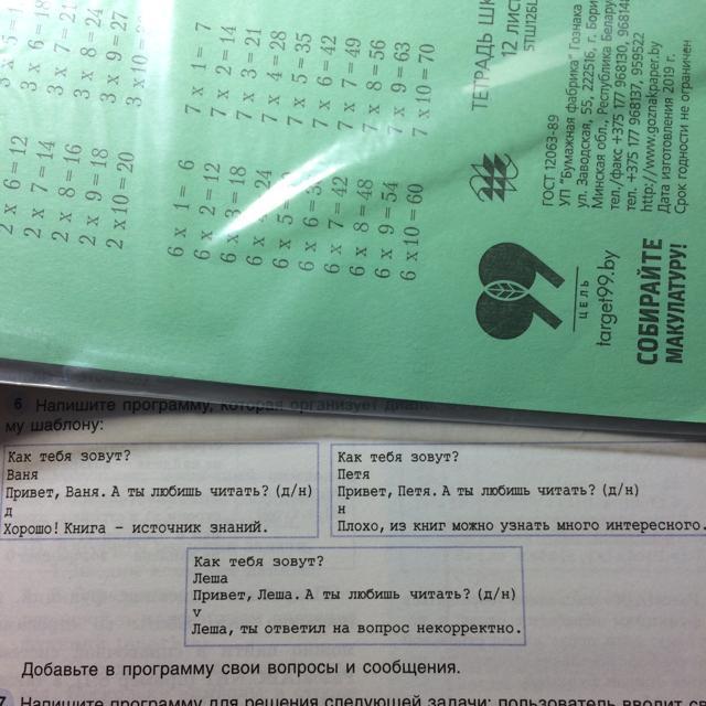 Напишите программу, которая организует диалог с пользователем по следующему Шаблону. Добавьте в программу свои вопросы и сообщения