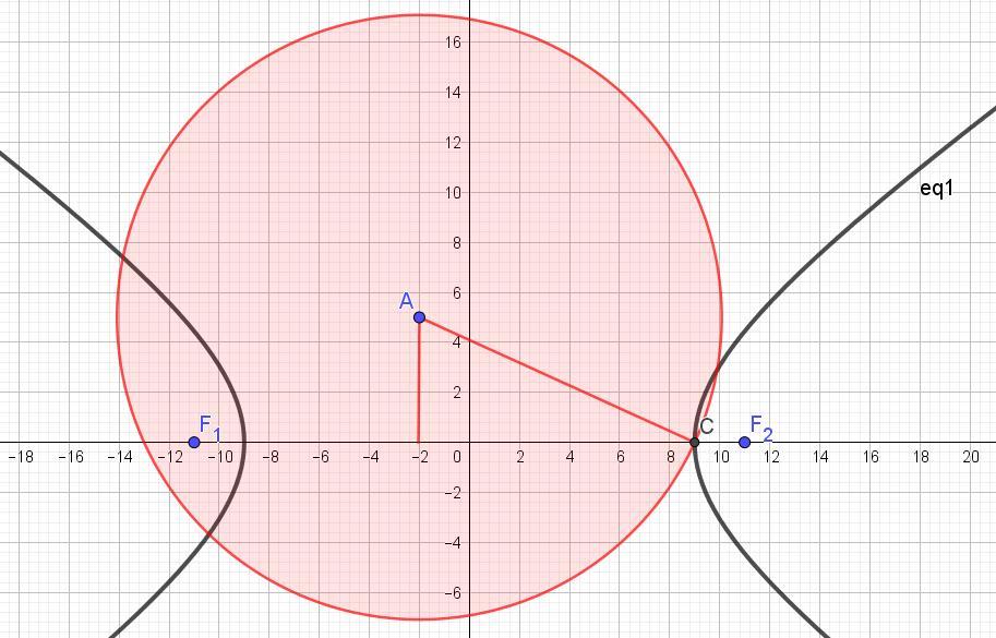 Определить уравнение окружности, проходящей через правую вершину гиперболы 40x² - 81y² = 3240 и имеющей центр в точке А(-2; 5).