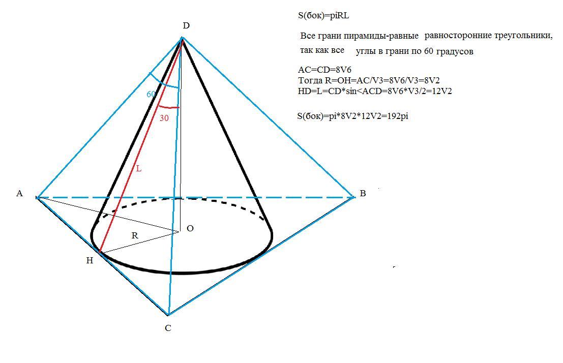 Конус вписан в треугольную пирамиду. Все боковые рёбра равны и образуют между собой углы величиной 60 градусов.