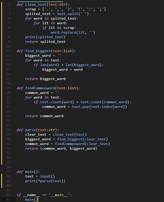Надо написать программу, которая принимает текст и выводит два слова слова: наиболее часто встречающееся слова и самое длинное слово.
