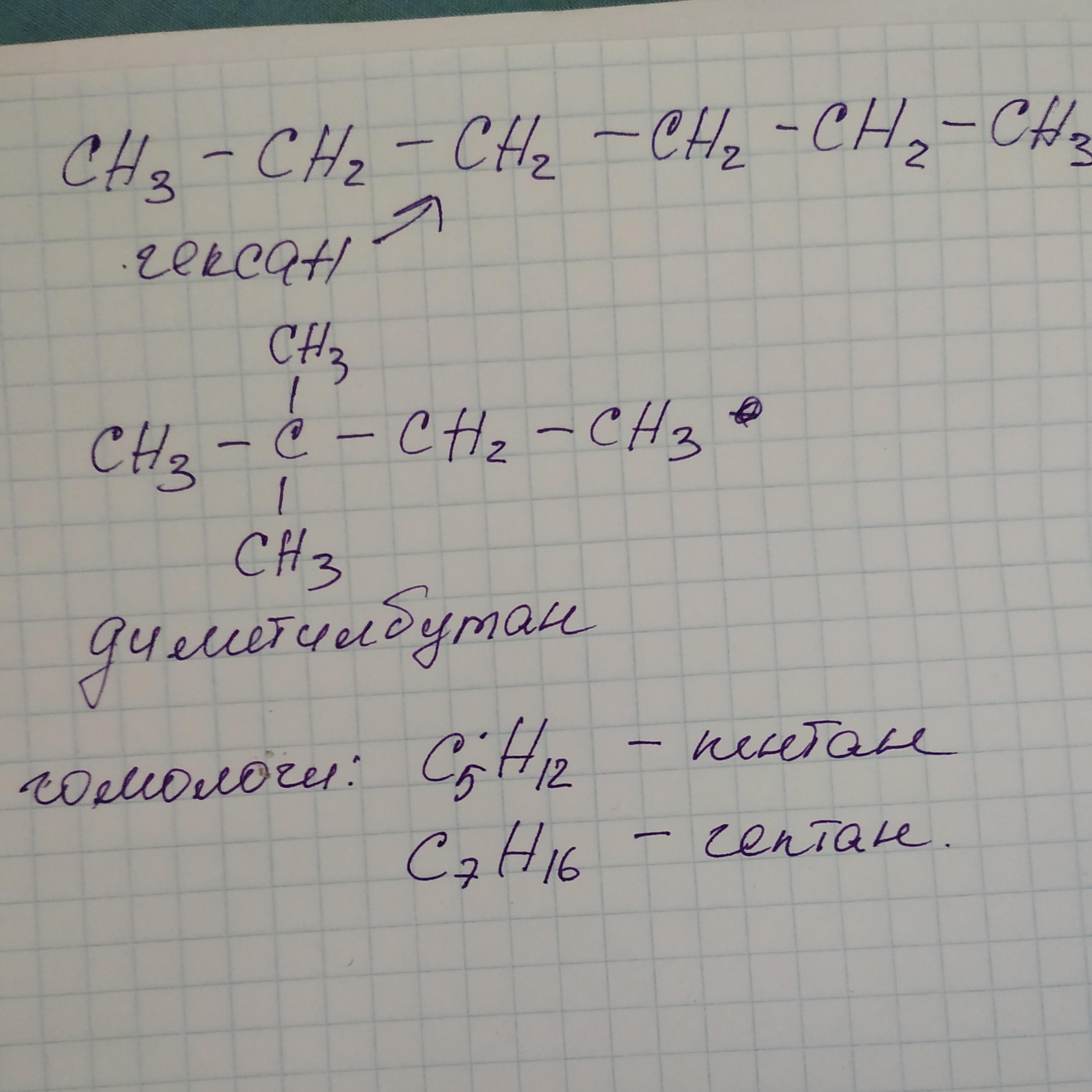 Ответ: изомеры: гексан и 2,2диметилбутан. Гомологи С5Н12- пентан, С7Н16 гептан