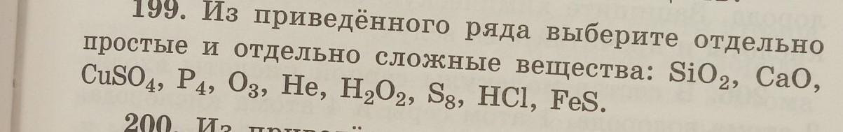 Из данного списка простыми веществами являются : O3,He, P4, S8. ,а сложными являются соответственно все остальные то есть H2O2, Cu SO4, HCl, CaO,SiO2, FeS