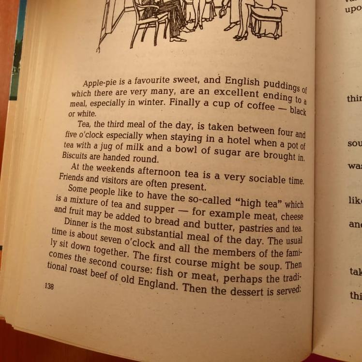 Обед (ужин) – самый значительный приём пищи за день. Обычно это семь часов вечера и все члены семьи садятся за стол вместе. На первое подают суп. Затем подают второе блюдо: рыбу или мясо, возможно традиционный ростбиф старой Англии. Затем подают десерт: