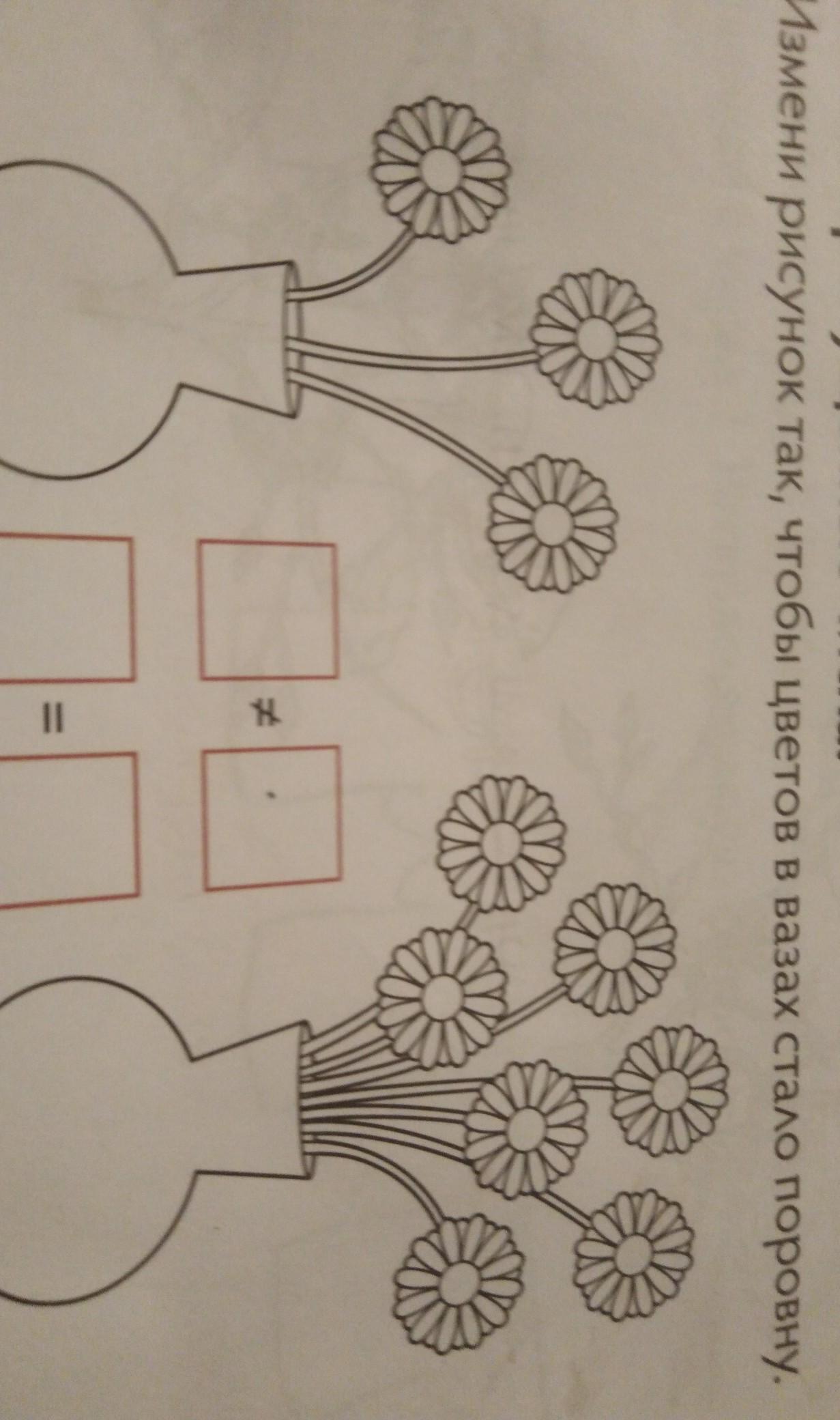Просто нарисовать еще 4 цветка в верхнюю вазу( в которой 3 цветка). Потом написать 3≠7 и 7=7