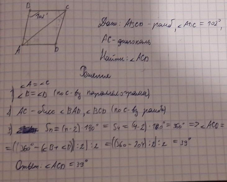 В ромбе противоположные углы равны, следовательно АBC=ADC=102°