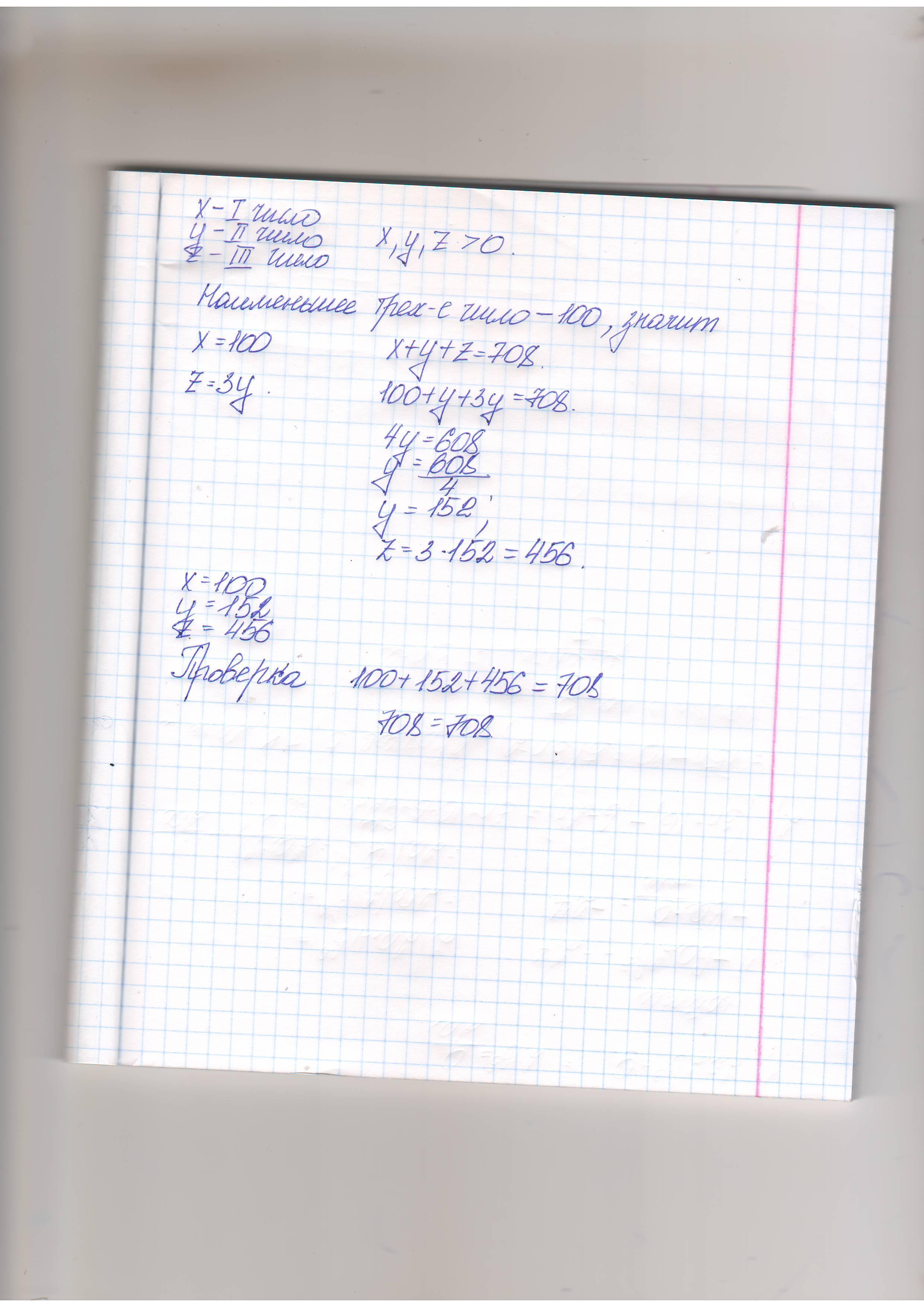 Сумма трёх натуральных чисел равна 708.первое из них -наименьшее трёхзначное число ,второе-в три раза меньше третьего.Найдите эти числа.(Можно можно с объяснением)