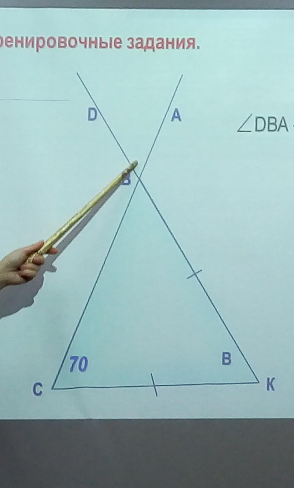 Угол DBA и CBK это вертикальные углы и они равны. Значит угол DBA = тоже 70°