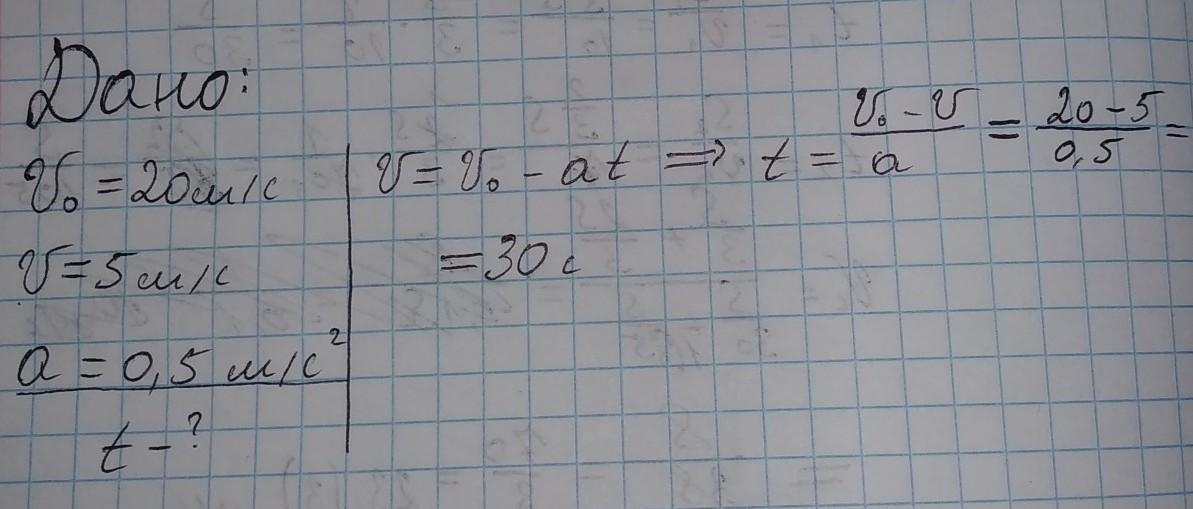 за какое время скорость тела изменилось от 20 м/с до 5 м/с если тело двигалось с ускорением 0,5 м/с