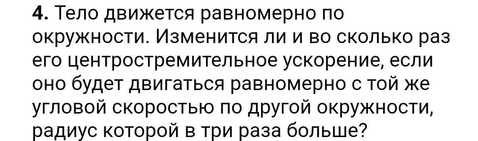 Тело движется равномерно по окружности. Изменится ли и во сколько раз его центростремительное ускорение, если оно будет двигаться равномерно с той же угловой скоростью по другой окружности, радиус которой в три раза больше?