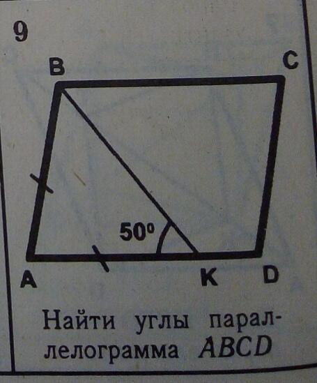 1)ABCD параллелограмм, значит АД ║ВС,ВК-секущая, ∠АКВ=∠СВК=50 как накрест лежащие.