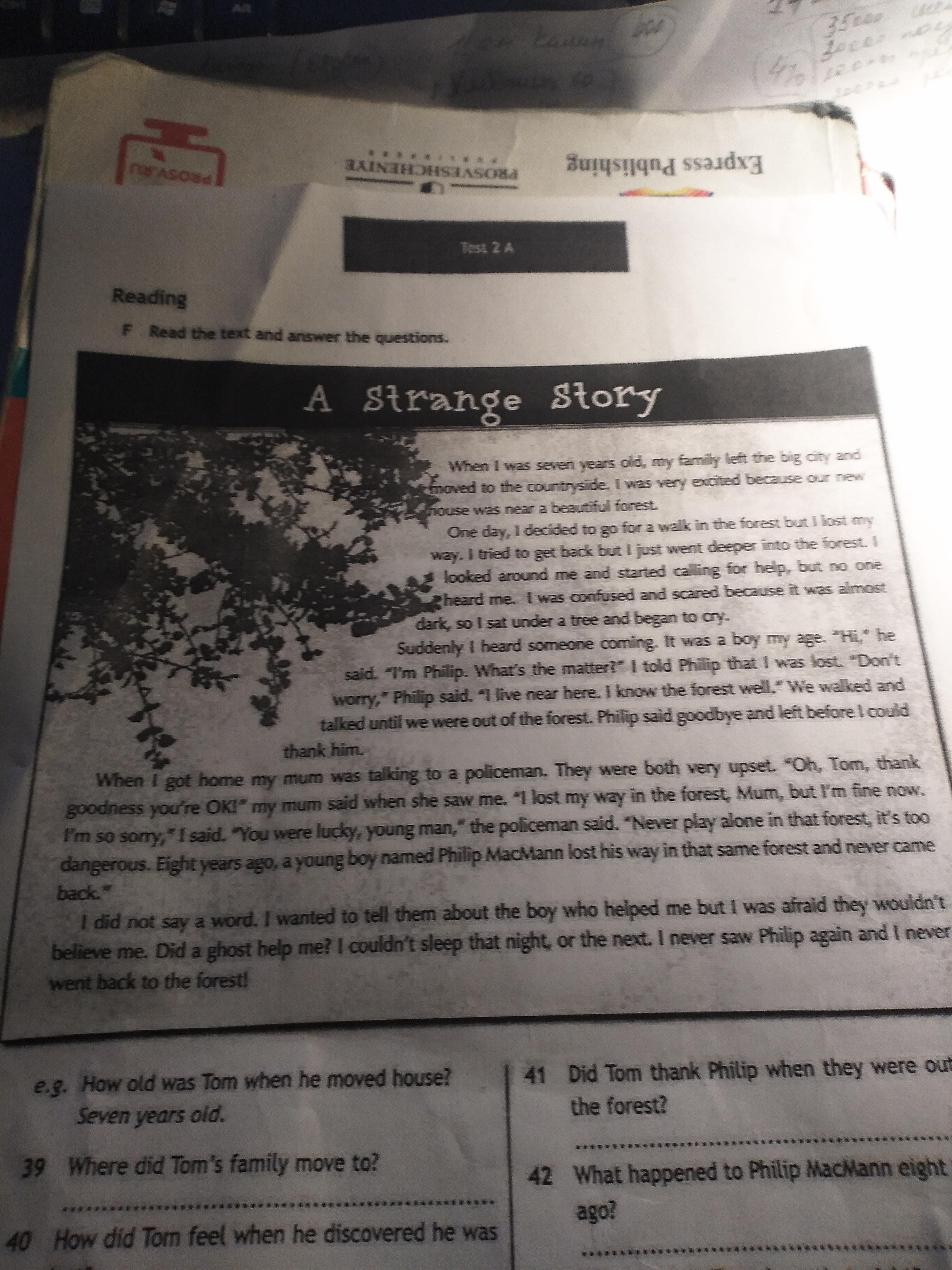 Когда я пришел домой, моя мама говорила с полицейским. Они оба были очень растроенными. "Ох, Том, слава Богу ты жив!" моя мама сказала мне, когда увидела меня. "Я потерялся в лесу, мам, но сейчас я в порядке, извини". Сказал я. "Ты счастливчик" сказал полицейский. "Никогда не играй один в лесу, это очень опасно, 8 лет назад маленький мальчик по имени Филипп МакМэн потерялся в том же лесу и так никогда и не вернулся".