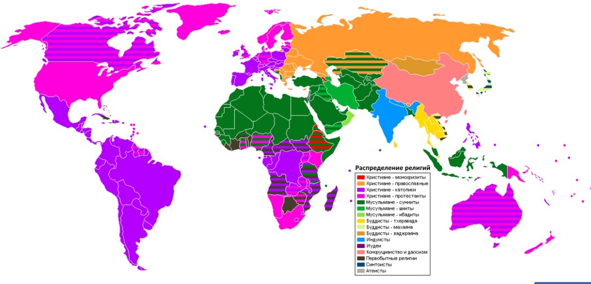 2)Евразия,в меньшей степени Африка-религиозный состав населения наиболее разнообразен.