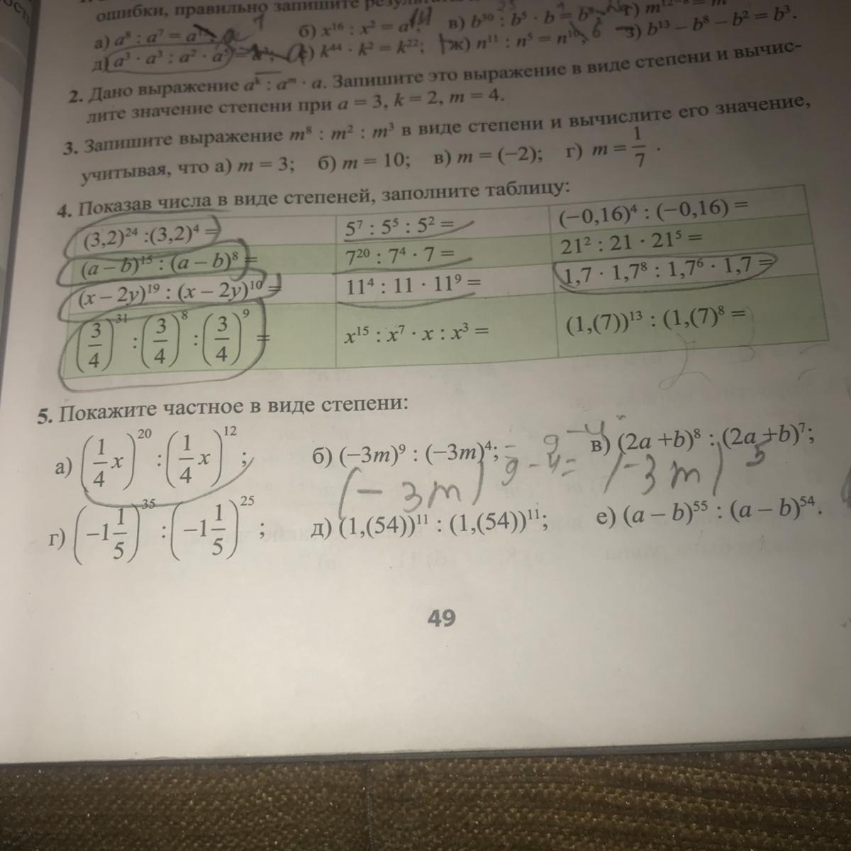 Поскольку основания степени везде равны, и поскольку при делении мы вычитаем показатели степени, то сразу приведу ответы: