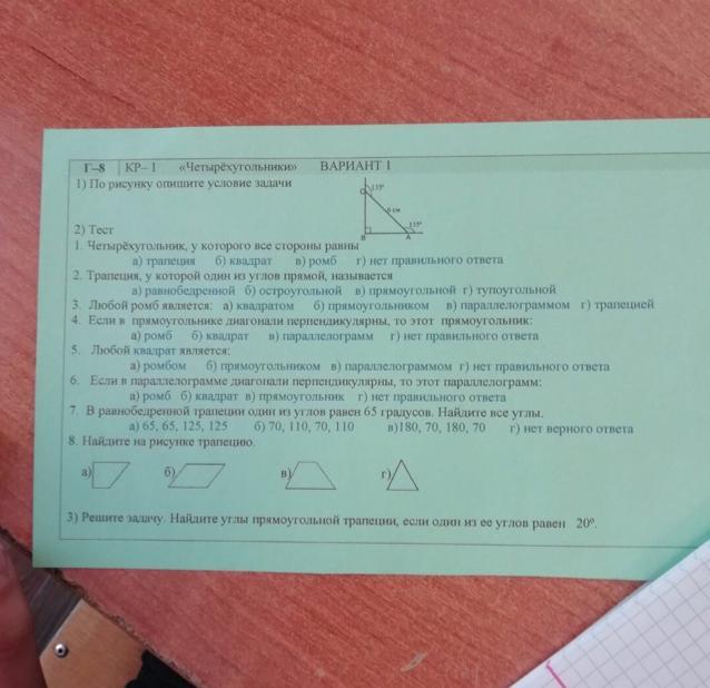 1) квадрат 2)прямоугольной 3)параллелограмм 4)параллелограмм 5)нет правильного ответа 6)прямоугольник 7) 65;65;125;125 8)В