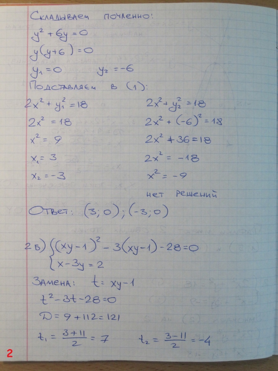 2. решить систему уравнений: а) 2х²+у²=18, -х²+3у=-9; б) (ху-1)² -3(ху -1) - 28 = 0, х-3у=2.