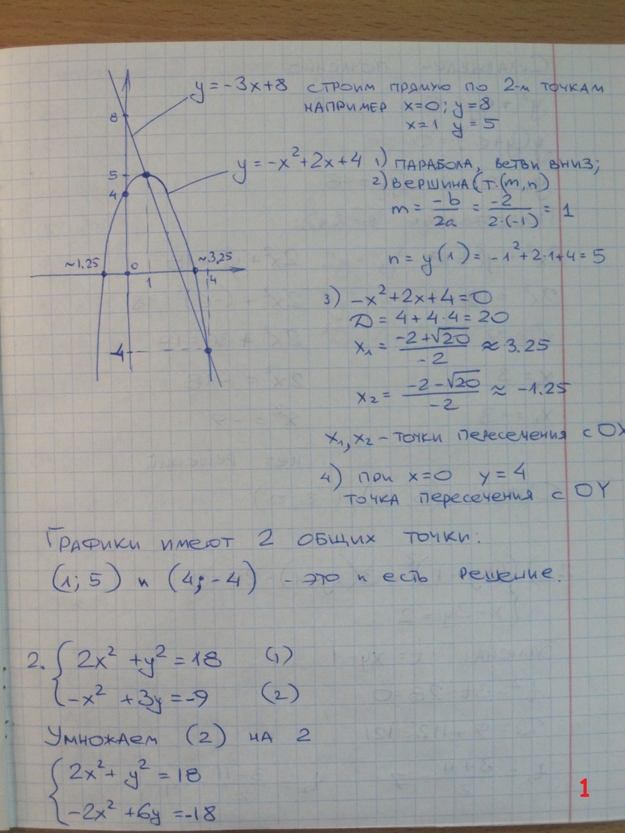 1.решить графически систему уравнений -х² + 2х + 4=у, у+3х=8.