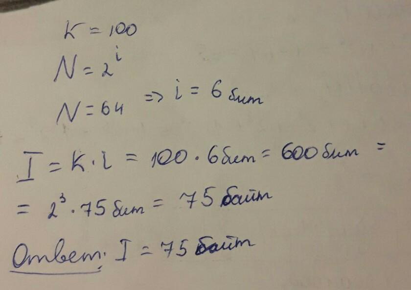 Какое кол во информации содержится в сообщение из 100 символов, записанном буквами из 64 символьного алфавита