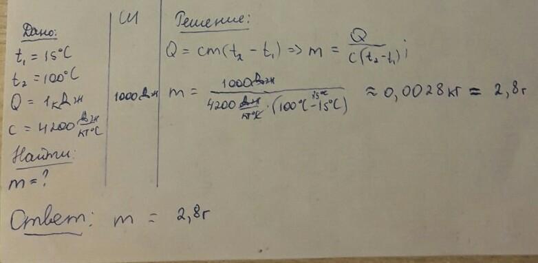 мальчик вычислил что при нагревании воды от 15 до 100 потребовался 1кДж количества теплоты. Какова масса воды