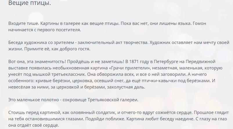 Согласования:Вещие птицы,заключительный акт,доброго гостя,Передвижной выставке,необыкновенная картина,незаметная,маленькая,кривые берёзки,осевший снег,невесёлая,маленькое полотно,Третьяковской галереи,оловянный солдатик,остановившимися глазами