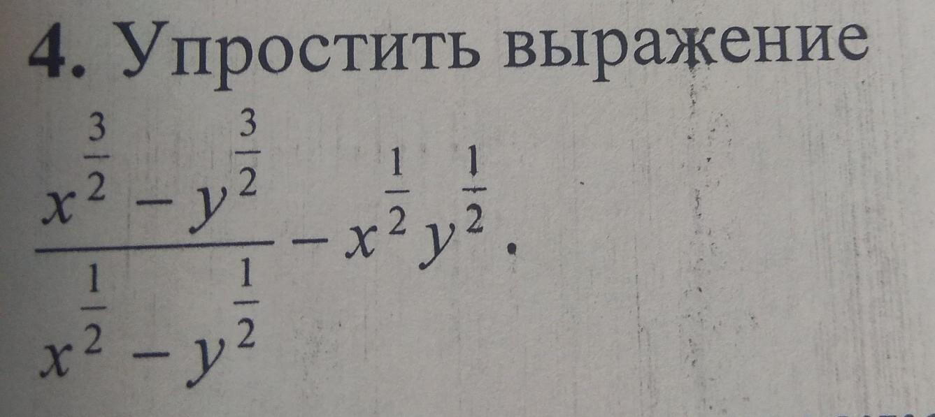 \frac{x^{\frac{3}{2}}-y^{\frac{3}{2}}}{x^{\frac{1}{2}}-y^{\frac{1}{2}}}-x^{\frac{1}{2}}y^{\frac{1}{2}}=\frac{(x^{\frac{1}{2}}-y^{\frac{1}{2}})(x+x^{\frac{1}{2}}y^{\frac{1}{2}}+y)}{(x^{\frac{1}{2}}-y^{\frac{1}{2}})}-x^{\frac{1}{2}}y^{\frac{1}{2}}=x+y