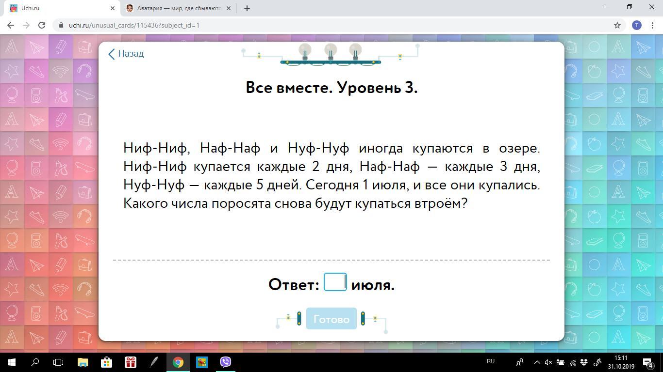 Наименьшее общее кратное - 30. Значит будут купаться втроем 31 июля.