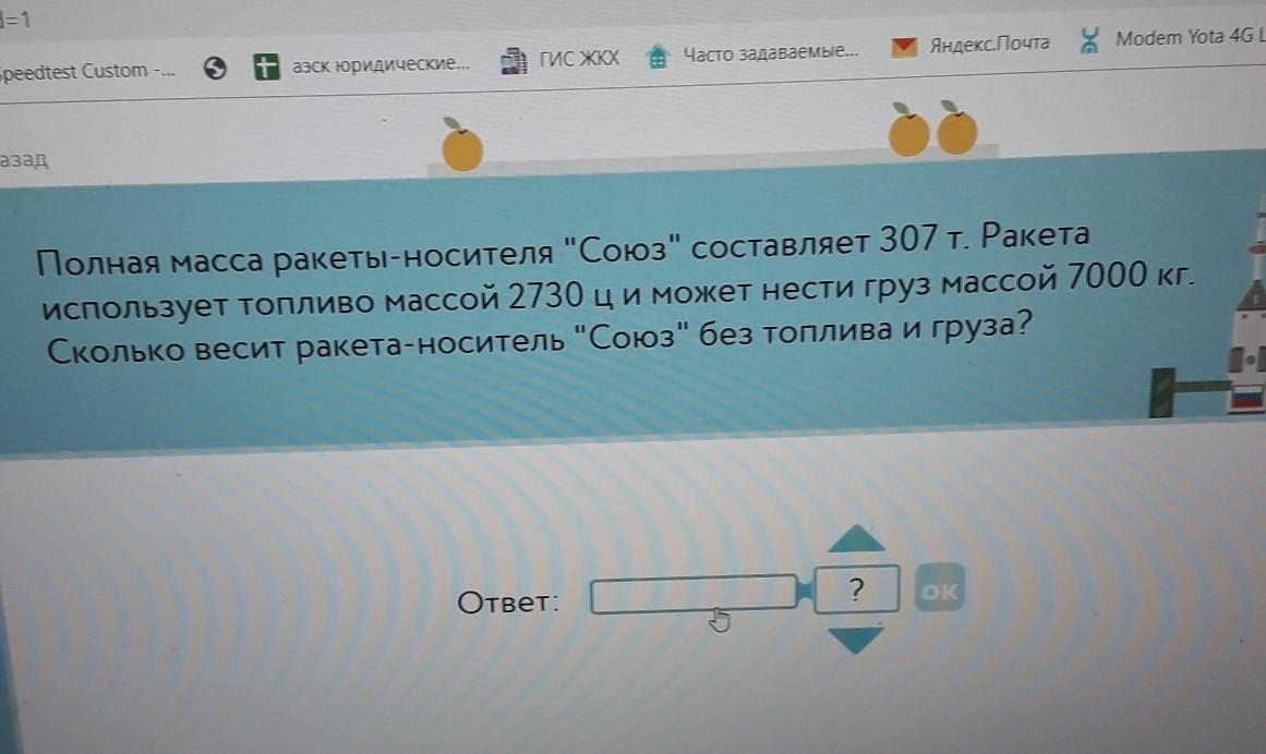 Ответ: 27 тонн весит ракета-носитель "Союз".