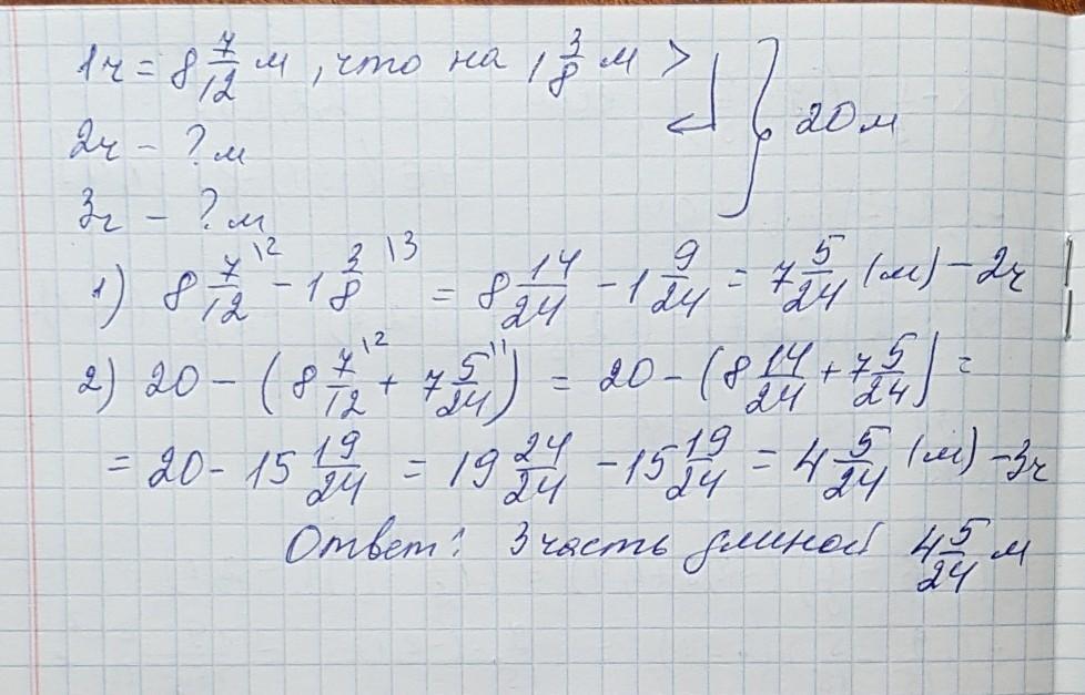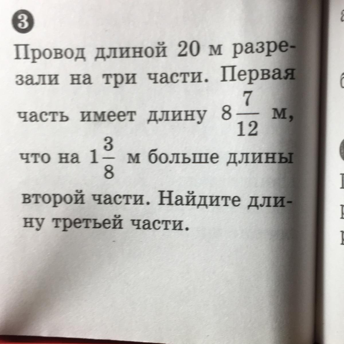 Решите задачу. Провод длиной 20 м разрезали на три части. Первая часть имеет длину восемь целых семь двенадцатых метров что на одну целых три восьмых метра больше длины второй части найдите длину третьей части