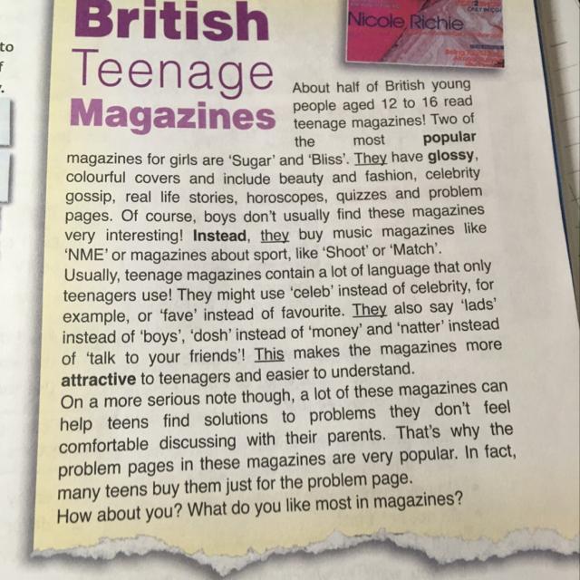 эбаут халф оф бритиш йанг пипл эйджд твелв то сикстин рид тинейдж мэгэзинс. ту оф зе мост попьюлар мэгэзинс фор гёрлс ар "Шугар" энд "Блисс". Зей хэв глосси каларфул каверс энд инклуд бьюти энд фэшн, селебрити госсип, рил лайф сторис, хороскопс, куизыс энд проблем пэйджес. Оф корс, бойс донт ужуалли файнд зииис мэгэзинс вери интерестинг! Инстед, зей бай мьюзик мэгэзинс лайк 'ЭНЭМИ' ор мэгэзинс эбаут спорт, лайк 'Шуут' ор 'Мэтч'.