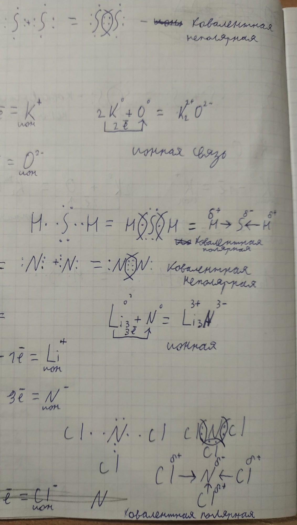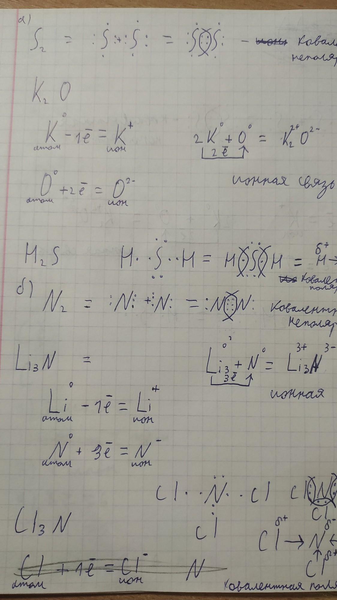 Определите тип химической связи и запишите схему ее образования для веществ с формулами:а)S2,K2O и H2S;Б)N2,Li3N и Cl3N.Пж ребят кто шарит.Заранее спасибо!