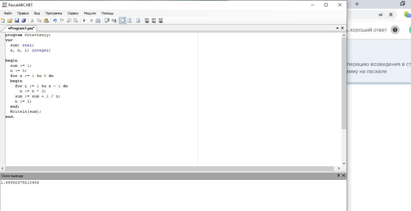 Вычислить сумму 1+1/3+1/3^2 +..+1/3^8 .Операцию возведения в степень не использовать.Напишите полную программу на паскале